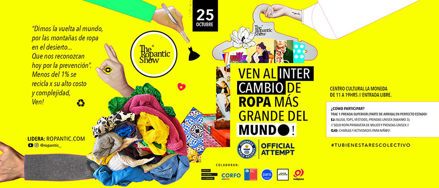 El pasado, presente y futuro es la colaboración para una moda mas consciente, por ello nos unimos a Almacenes Paris y Mall Costanera Center en un evento Ropantic XL con aforo de 1.500 personas, conversatorios y talleres de Moda Circular en paralelo, además del Showroom de intercambio. Este evento es gratuito y tiene modalidad 4×3 donde traes 4 prendas y te llevas 3 ya que el propósito es “reducir tu consumo”. Este evento se realiza gracias al auspicio de paris.cl y su programa de “moda circular” junto a la colaboración de Shopping Cencosud.